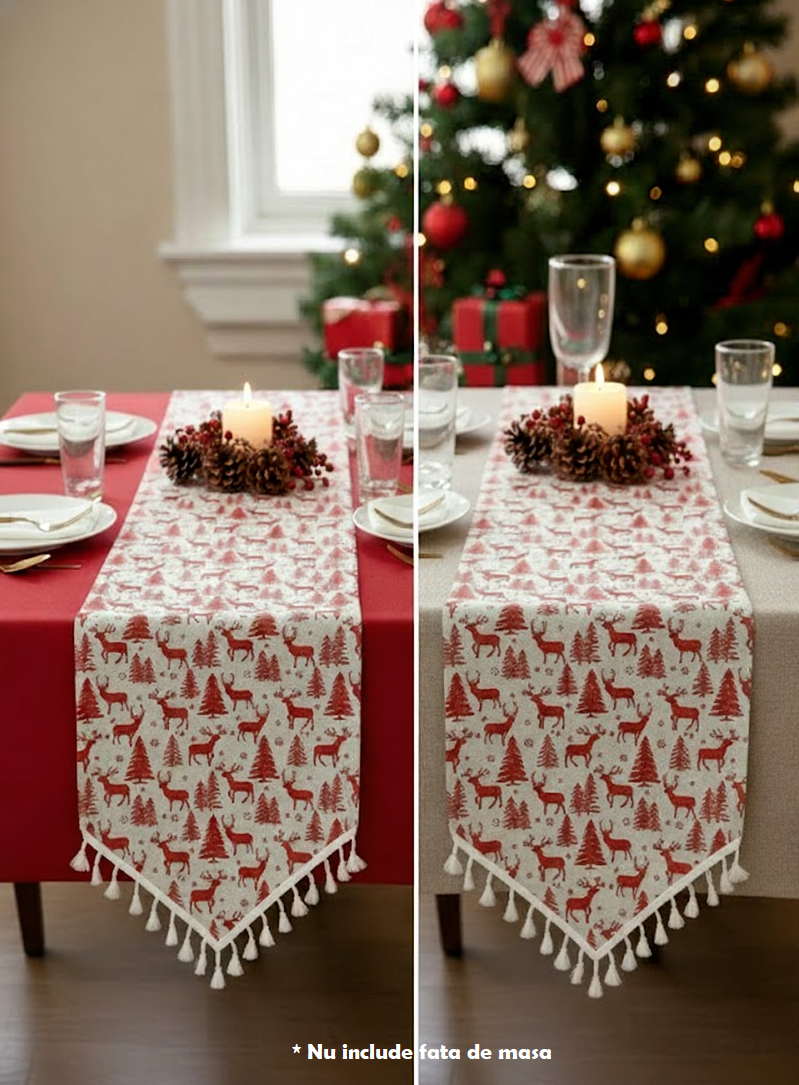 Transforma masa de sarbatori intr-un colt de poveste cu Runnerul XMAS cu reni, un accesoriu decorativ care aduce instant atmosfera de Craciun.