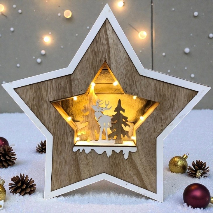 Cu un design simplu dar elegant, cu figurine de specifice iernii, aceasta stea din lemn natural creeaza un efect vizual spectaculos, iluminat de LED-uri calde.
