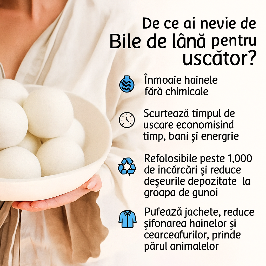 Bilele din lana sunt concepute pentru a imbunatati procesul de uscare al hainelor. Fabricate din 100% lana naturala, bilele sunt reutilizabile, pana la 1000 de cicluri, oferind calitate si rezistenta. Bilele reduc semnificativ timpul de uscare cu pana la 50%, micsoreaza electricitatea statica, atrag parul.